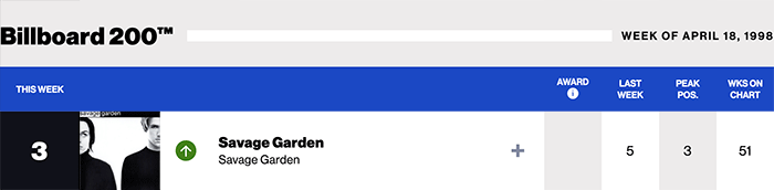 |Billboard Chart History(Savage Garden)| |Darren Hayes.com|Level 7 Studios.com|
