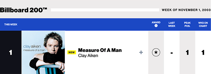 |Clay Aiken.com|Clay Aiken(Billboard chart history)|