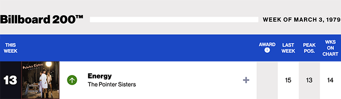 |The Pointer Sisters.com|The Pointer Sisters(Billboard chart history)| |Bruce Springsteen.com|Bruce Springsteen(Billboard chart history)|