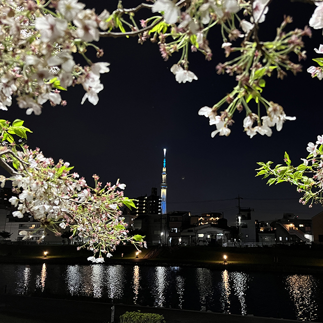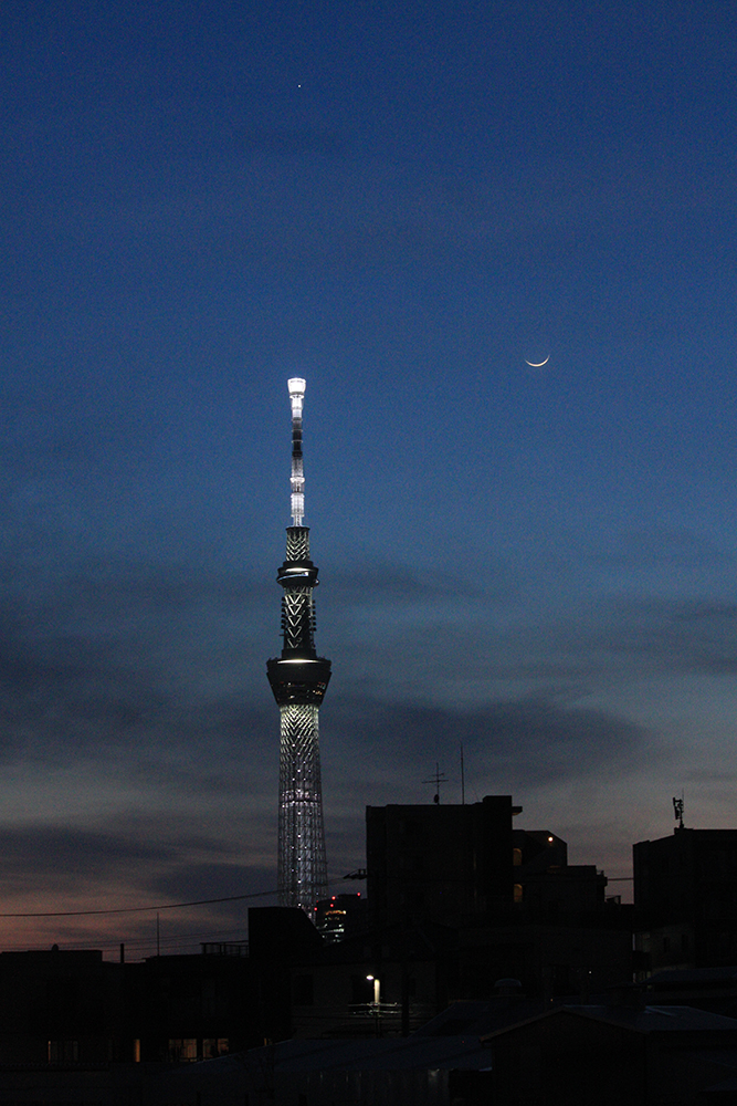 2日前の2024年4月8日にアメリカを縦断するように皆既日食が見られた。僕はテレビ中継でその様子を眺めていたが、その直接の原因を作った「月」が2日後に日本の空に戻ってきた。それも木星を従えた形での登場である。これはなんとか見たいと思い、仕事が終わってから西の空が少しでも開けた場所を探しているうちに、意外と月が空高く姿を表してくれていることがわかり、ゆっくりと場所探しをすることができた。当初から、都内を流れる川の東側にいれば、なんとか西の空は視界が広いだろうと予想して、ぶらぶらしているうちに夜桜とコラボしてくれる場所を見つけることができた。