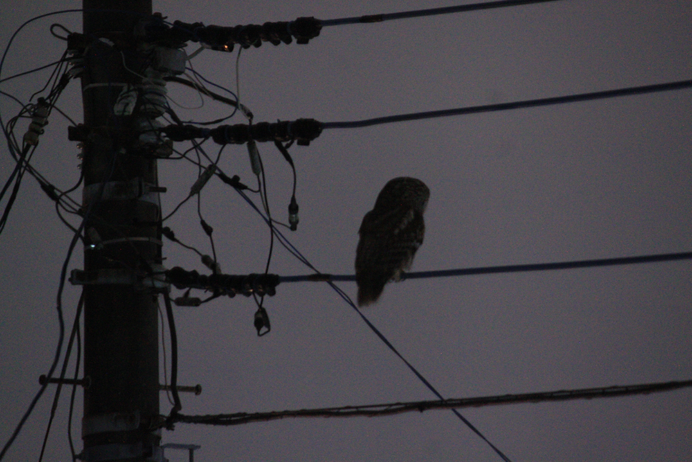 以前住んでいた家の隣は空き家で、元緑地帯だったところに住居を建てたところ。その当時そこに植えられていた木がまだ残っていて、時々ふくろうがやって来ていた。彼らが独特の声で夜のしじまに声を響かせる時期になると、こちらの感覚も敏感になっていて、どんなに部屋の中がうるさかろうと、フクロウの声が聞こえると「あっ、来てる!」と言って部屋の明かりを全部消して、窓からそっとシルエットを眺めて楽しんでいた。きっと夜目が効く彼らからは、こちらがよく見えていたに違いない。