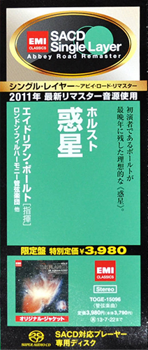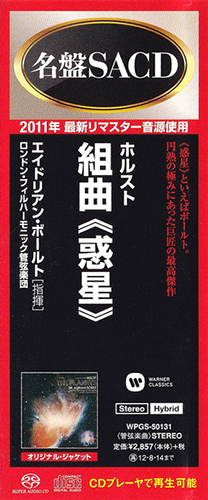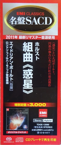 | 2012年12月、待ちに待ったボールト4回目の「惑星」がSACD化されましたのですが、なんとE社からのまじりっけの強い製品化でした。当初は狂喜しましたが今となっては…ね。 しかし、2015年には本家のEMIから、そしてタワーレコードからSACD化が行われ、本来の記録を最高の状態で聞くことができて感無量です。 |