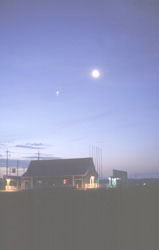 | 頭上で起きている神々の饗宴、ジュピターとヴィーナスが、何も知らずに寝ているシルエットの家々を静かに見守っている中、僕は車のフロントガラス越しに二人の姿を見やりながら、撮影地へと急いだ。 |