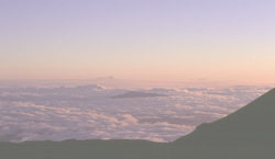 | 残念なことに宴たけなわといったところで入道雲のように見えた天の川がだんだんと薄れはじめ、雲海からは満月過ぎの大きな月が昇ってきてしまった。その雲海の中にハワイ島刑務所が見えるという説明を受けると、とたんに現実(下界)に降りてきてしまったような気がした。 |