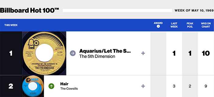 | このページでは1969年の全米ナンバーワンソングを紹介します(このページついて)。ここ数年、音楽の聞き方が変わって来たことが、チャート集計にも影響を与えているようです。 2018年から、ストリーミングデータ(音楽配信)の集計方法を変更しました。また、これまではチャートの日付の1週間前の火曜日(つまり11日前)に発表されていましたが、データ集計から発表までの期間が短くなり、日付の4日前に発表され、よりリアルタイムに近い発表になりました。たとえば最新チャートなら2025年7月5日、発表は7月1日となります。 (最新の1位はコチラ)。