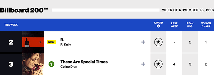 |Celine Dion.com|Celine Dion(Billboard chart history)| |R.Kelly.com|R.Kelly(Billboard chart history)|