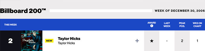 |Taylor Hicks.com|Taylor Hicks(Billboard Chart History)|