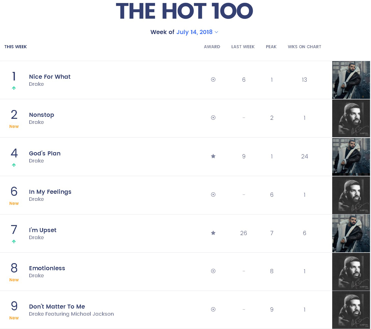| このページでは2018年の全米ナンバーワンソングを紹介します(このページついて)。ここ数年、音楽の聞き方が変わって来たことが、チャート集計にも影響を与えているようです。 2018年から、ストリーミングデータ(音楽配信)の集計方法を変更しました。また、これまではチャートの日付の1週間前の火曜日(つまり11日前)に発表されていましたが、データ集計から発表までの期間が短くなり、日付の4日前に発表され、よりリアルタイムに近い発表になりました。たとえば最新チャートなら2024年7月6日、発表は7月2日となります。 (最新の1位はコチラ)。