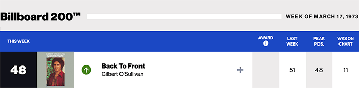 |Gilbert O'Sullivan.com|Gilbert O'Sullivan(Billboard Chart History)|