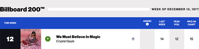 |Crystal Gayle.com|Crystal Gayle(Billboard Chart History)|