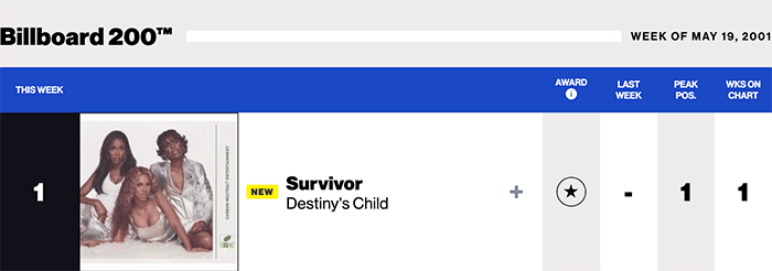 |Destiny's Child.com|Destiny's Child(Billboard Chart History)| |Beyoncé Knowles.com|Beyoncé(Billboard chart history)| |Kelly Rowland.com|Kelly Rowland(Billboard Chart History)|