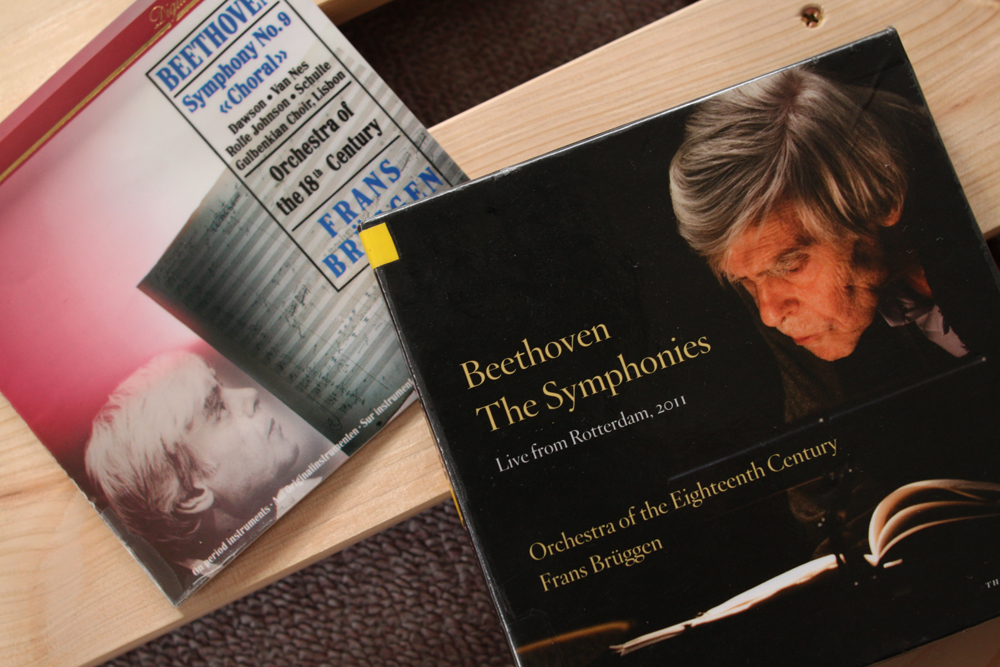 | ブリュッヘン最晩年のベートーヴェン。最初のは1984年から8年掛けてレコーディングされたフィリップス盤でしたが、今回は全曲2011年10月6日〜10月16日という短期間でのレコーディング、しかもSACD!2013年4月に、初めて生のブリュッヘンを聴く機会がありましたが、すでに彼は自身で経つことも歩くこともできず、介助と車いすでステージに登場しました(演目はショパン)。私がベートーヴェンを聴きはじめたのがガーディナーからでしたが、同じピリオド演奏として、このブリュッヘンやホグウッドの演奏をあちこちの図書館で借りて楽しんでいました。 |
