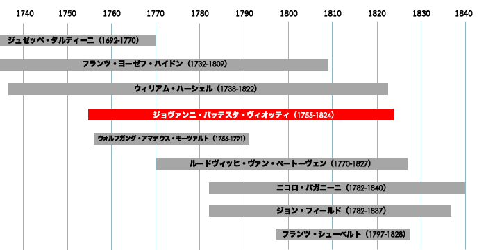 | ヴィオッティが活動していた時代の天文の世界を覗いてみると、望遠鏡などの技術革新が起こったことが引き金となって、現代天文学を切り開く発見が数多くニュースになりました。特に音楽界と天文学の交差する出来事として、ミヒャエル・ハイドンの1つ年下の作曲家ウィリアム・ハーシェル(1738-1822)が趣味の中で発見した天王星の発見でしょう。 彼の世界、つまり音楽界はベートーヴェンが楽壇にデビューしてから新しい風が吹き荒れ、古典派からロマン派への架け橋が架けられることになります。それに感化された新鋭の作曲家も次々と登場しました。そして、天文学の世界でもおこった技術革新は、産業革命後の音楽界にも影響を与え、次々と新しい楽器、改良された楽器が生み出されました。 |