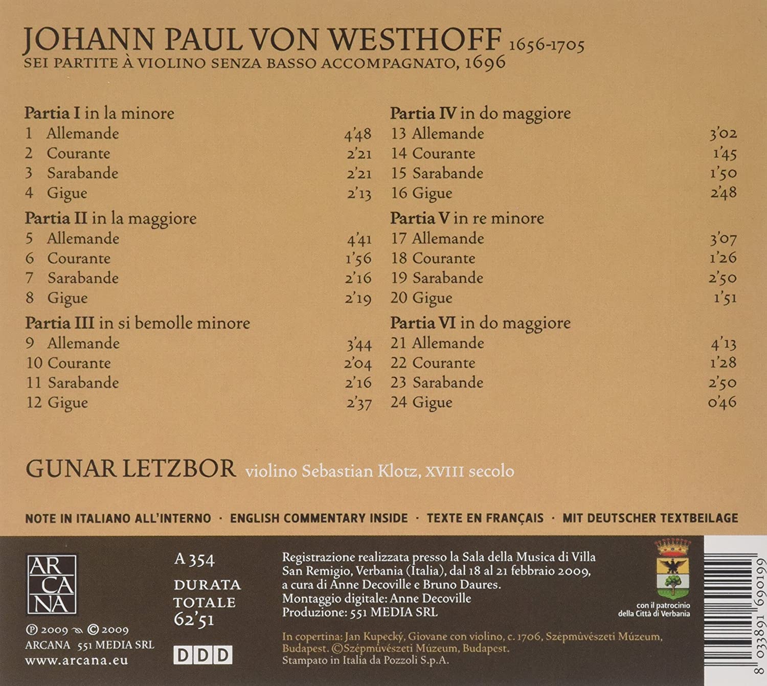 無伴奏ヴァイオリンのためのパルティータ パルティータ 第1番 イ短調 (Allemande / Courante / Sarabande / Gigue) パルティータ 第2番 イ長調 (Allemande / Courante / Sarabande / Gigue) パルティータ 第3番 変ロ長調 (Allemande / Courante / Sarabande / Gigue) パルティータ 第4番 ハ長調 (Allemande / Courante / Sarabande / Gigue) パルティータ 第5番 ニ短調 (Prelude / Allemande / Courante / Sarabande / Gigue) パルティータ 第6番 ニ長調 (Prelude / Allemande / Courante / Sarabande / Gigue) Gunar Letzbor; Violin |
