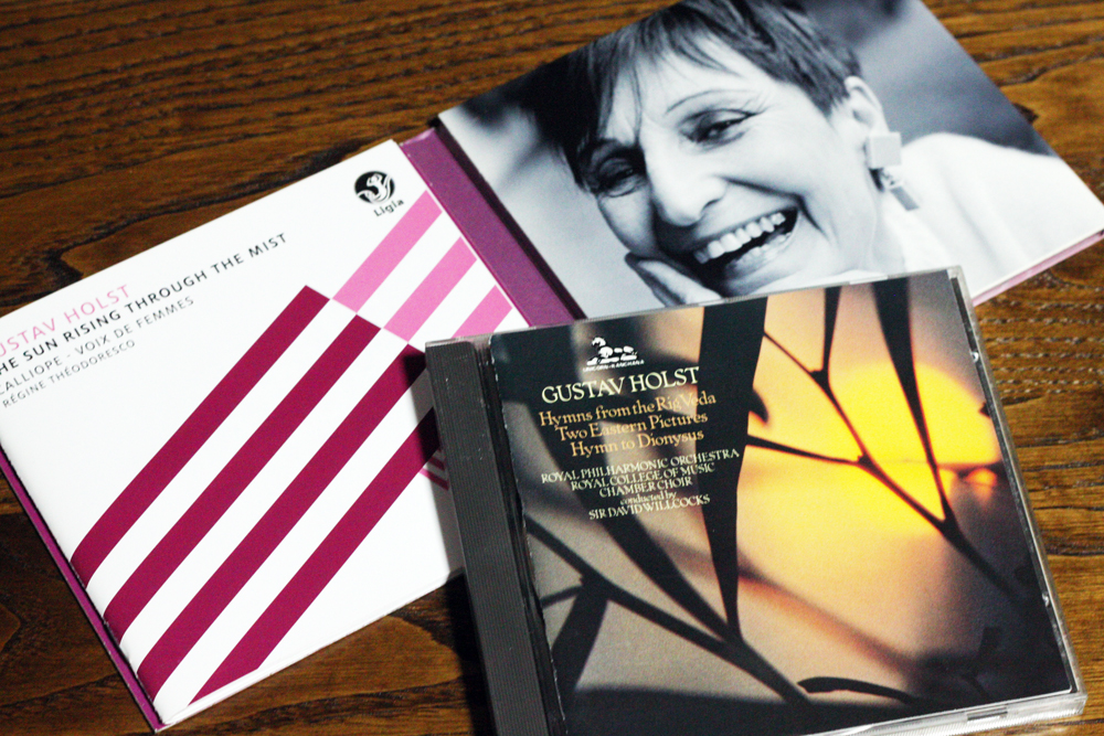 テキストがインドのリグ・ヴェーダという古代インドの聖典から採用しているところから、なんとなくインドっぽい(ビートルズでいうところのジョージ・ハリスンや、ラヴィ・シャンカールみたいな感覚で想像してしまうと全く違います)音楽を想像してしまいますが、インド音楽に影響を受けたのではなく、その精神に影響を受けているので、まったくの西洋音楽(平均律)に成り立って作曲されています。ホルストはこの聖典に影響を受けて、サンスクリッド語を勉強し、この曲に採用した讃歌を自ら翻訳して、それに作曲したのです。 このアルバムでは曲集の順番通りではなく、第二群の女声合唱と管弦楽から始まり、第一、三、四群と並んでいます。その前に収録されているディオニュソスが管弦楽と女声合唱という編成だからでしょうか? 続けてバリバリの西洋音楽が奏でられ、歌詞がわからないリスナーには普通に平均律の音楽になっています。実はこの曲を初めて手にしたのは、ウィルコックスのアルバムではなく、下で紹介しているカリオプ女声合唱団の2013年の新録がリリースされた一枚でした… |