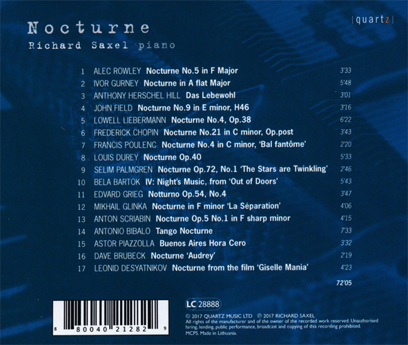 | クラシックの世界でも広まりつつあるクラウドファウンディング。多くのリスナーに支えられて、ここにも一枚のアルバム、しかも『夜想曲』ばかりを集めた一枚が登場しました。 選曲基準は不明ですが、有名な作曲家に混じって、初めて名前を聞く作曲家の作品の多いこと!こんなにもこのジャンルの作品が作曲されていたなんて、ファンとしては嬉しい限り。オムニバスとはいえ貴重なアルバムです。私の知らない作曲家が多数!(って、私が無知なだけ…) |