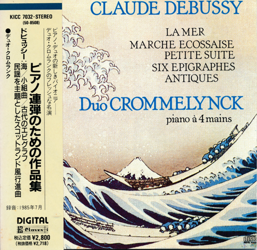 | またまた登場のデュオ・クロムランクのおしどり夫婦によるコンビ。ここではドビュッシーの「海」のピアノ版がメイン・ディッシュとなります(笑)。同じようにおしどり夫婦である永井&アシャツのコンビもドビュッシーに取り組んでくれていますが、そちらはカプレの編曲によるものです。 |