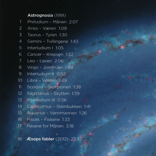 1991年に作曲された『アストロノーシア』は、現代音楽の中にあって、(私には)かなり聴きやすい管弦楽曲です。そんな親しみやすい曲だからか、本国ノルウェー作曲家作詞家協会において「1994年最優秀管弦楽作品賞」を受賞しています。 |