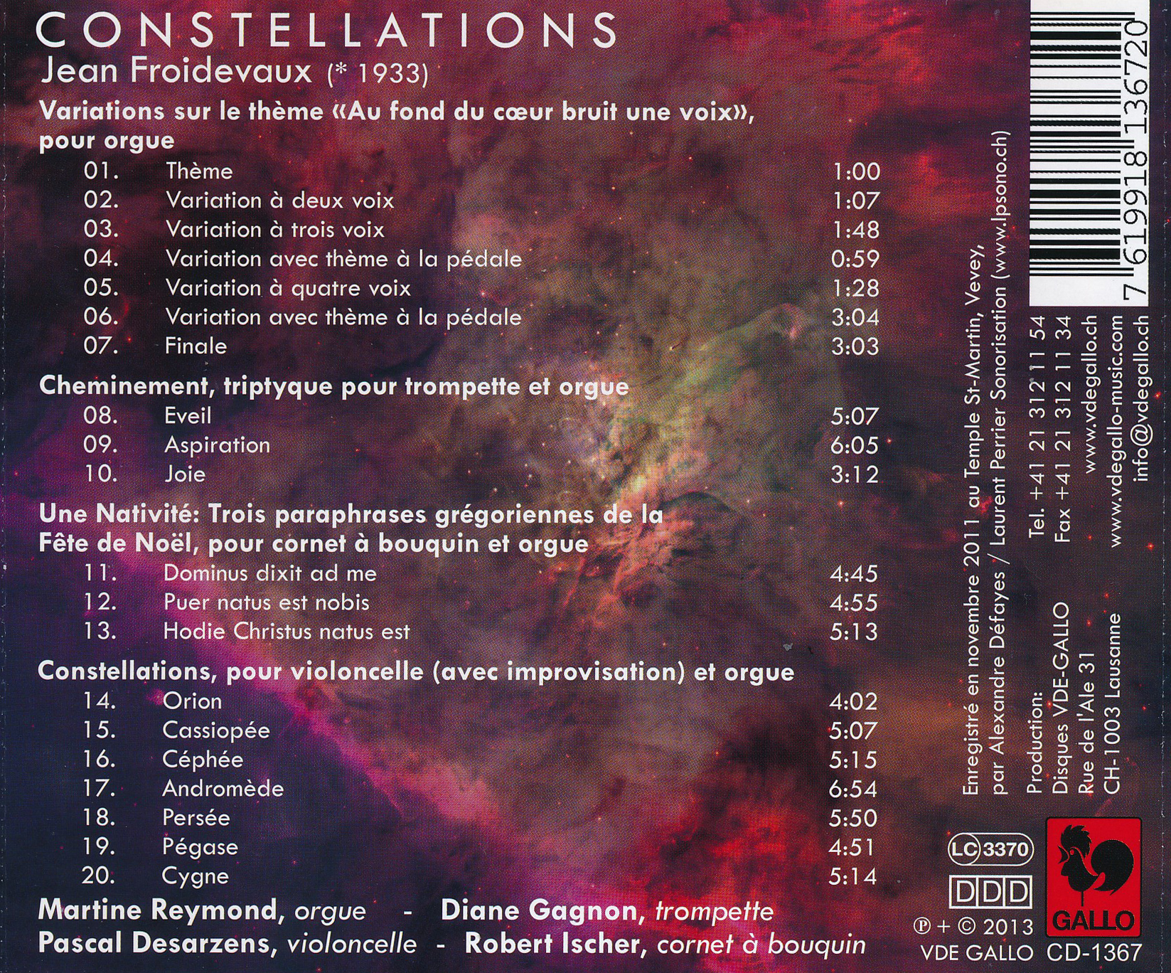 | メーカーによれば、このディスクに収められているチェロとオルガンのための「星座」の原曲は、ソプラノとオルガンのための楽曲であったらしいです。それを歌の部分をチェロに置き換えたものがこれ。7つの星座名がタイトルになっていて、星や天文学に興味のあるファンはなかなかそそられるないようではないでしょうか? この7つの星座のうち、カシオペア座からペガスス座の流れは、古代エチオピア王国を舞台としたペルセウスのアンドロメダ姫の救出劇として有名な登場人物ばかりです(アンドロメダを襲うセータス、くじら座が入っていませんが…)。 フランスの作曲家のジャン・フロワドゥヴォーは、星や天文学に興味があるのでしょうか?この他にも「プレアデス」というフルートとピアノのための7つの器楽曲を作曲しています。 アルバムジャケットは、一般的な知名度の高いオリオン大星雲。ハッブル望遠鏡の画像。 |