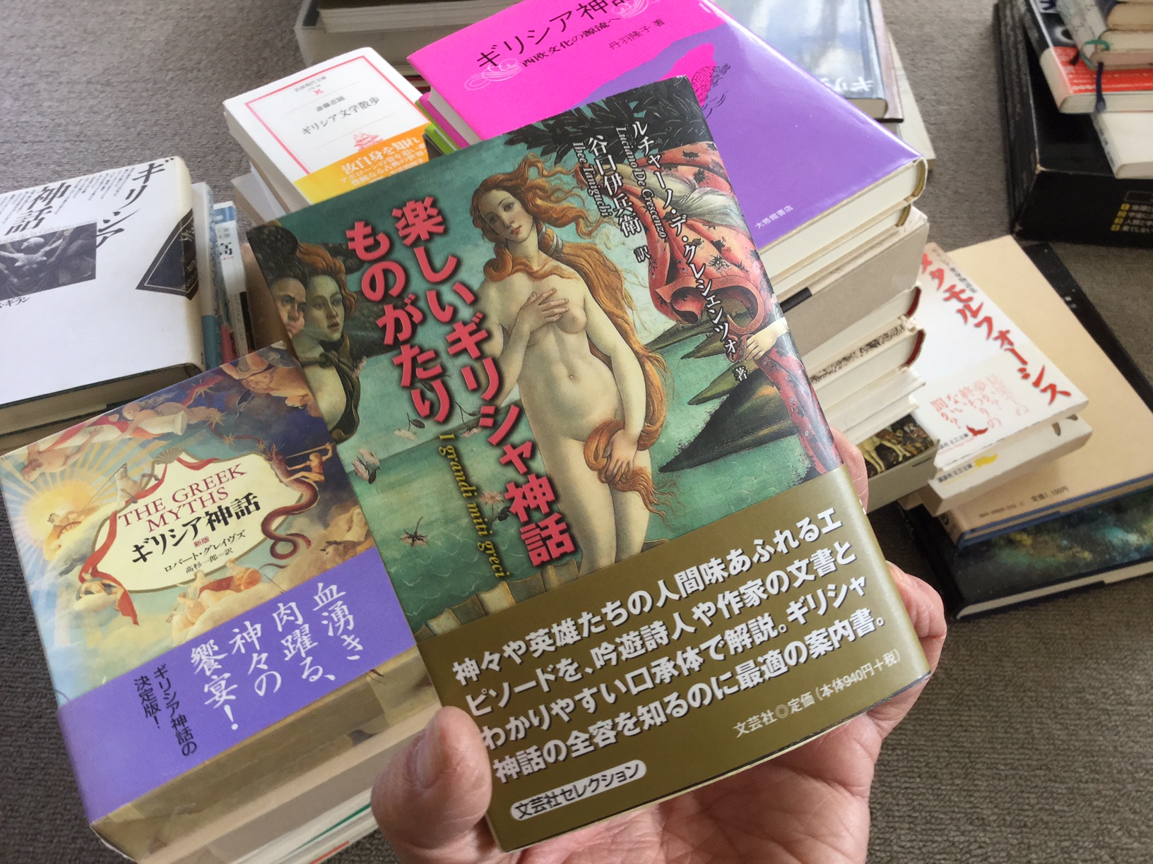| 1955年の出版。私の元には1998年の新装版。購入当時は、こんなに大きな書籍を買ったことが無かったので、買っただけでおなか一杯状態となりました(笑)。アポロドーロス、オウィディウスなどでは読むことのなかったエピソードも多く、帯にある「ギリシア神話の決定版!」も、あながちウソじゃないなぁ、と思いました。とくにオリオンの話は目からうろこ。 |