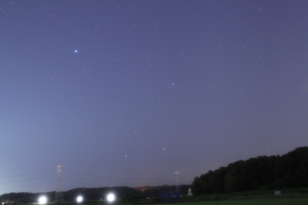 みなみのうお座が南天の子午線を通過する頃つる座も見ごろになる国道16号沿いの京葉工業地帯から離れること約1時間。何十年ぶりか、つる座のふたつの輝星を見つけることができました。肉眼では、すでに私の視力が衰えてしまっていることも加わり、β星の赤みが分からず、というよりもちゃんと見えたのはα星のみで、写真でやっと2つ確認できました。さすがに60秒もシャッターを明けっ放しにしておくと、肉眼では暗く見えた周辺もかなり明るくなってしまいました。 |