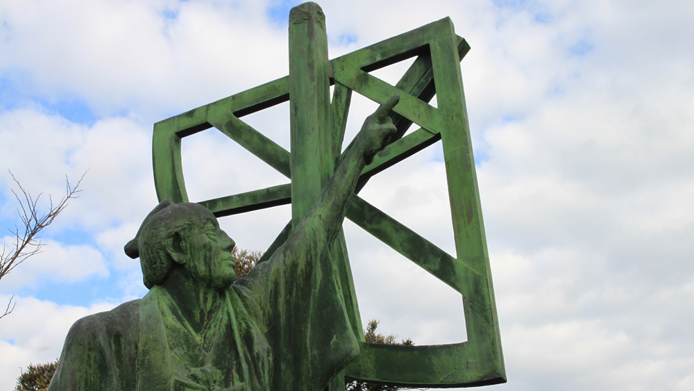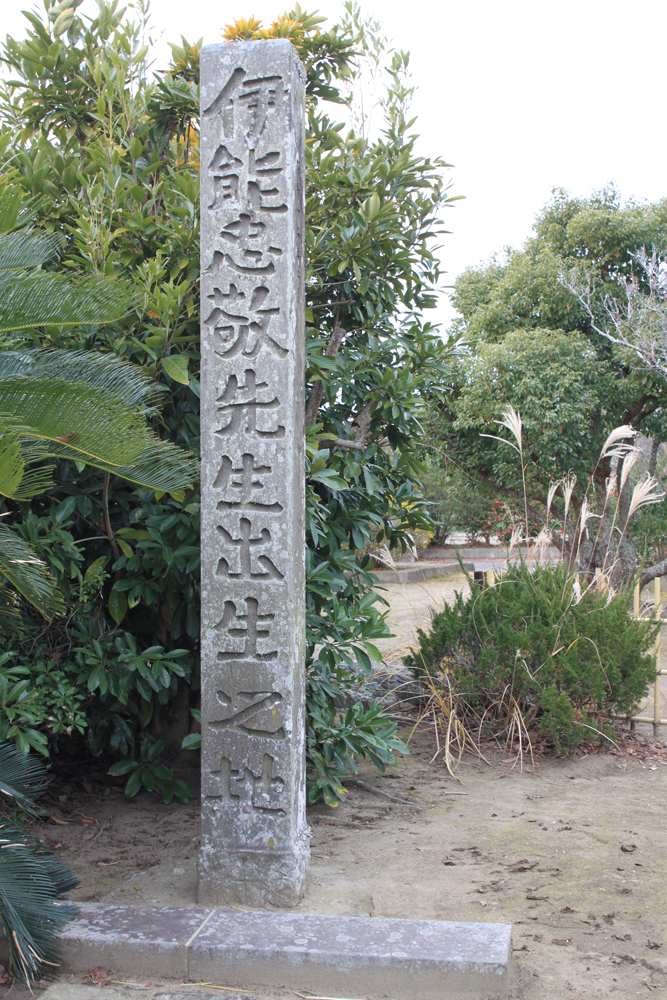 千葉は九十九里の小関。そういえば、昔から九十九里を見に行く時には決まって「伊能忠敬出生地」の看板を目にしていたことを思い出します。 私が訪れたのは暮れも暮れ、12/31ということもあり、全く人の姿はありませんでしたが、出生地とはいっても門前仲町にある住居跡同様、とくに史跡が残っている場所ではなく、現在は「伊能忠敬記念公園」として手入れの行き届いた公園に姿を変え、偉人を偲んでいました。そこには天測儀の横で天を指差す銅像が建立されています。 |