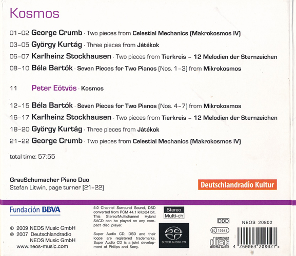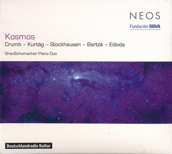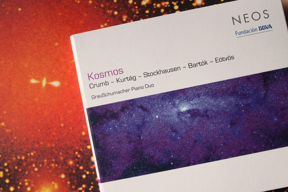 2台ピアノのために書かれた作品を集めたアルバムです(しかもオーディオファイルには楽しみ倍増のSACDマルチチャンネル仕様!)。収録曲は、アルバムジャケット(ジャケットの内側はハリケーンの衛星写真や、ロスアンゼルス・タイムスの人工衛星が地球を廻る記事など、それっぽいもの)や曲目を見てもわかる通り宇宙をテーマとした曲がズラリと並んでいるので、星好きには食指が伸びるのも当然… ですが、何しろ現代音楽(笑)ですから、少々の覚悟が必要です(笑)。 ピーター・エトヴェシュの『宇宙』は、彼が17歳の時に人類初の宇宙飛行を行なったソヴィエトのユーリー・ガガーリンの為に書いた作品(内ジャケットの新聞記事はそのため)。実はこの曲を中心としたプログラミングがされています。この曲を挟んでブランコのように曲が並べています。 それはさておき、この中心に配された曲は、スペーシー(浮遊感?)といった感触の曲ではなく、いきなり真空に放り出されたガガーリンが直面した危機に対して、彼の心境を音で描いたような音楽… のように感じてしまいました(なんか映画『ゼログラビティ』とかのシーンに合いそう)。 これも多くの現代音楽で取り上げられている宇宙とか、星座(結構多い)をテーマにした音楽同様、静かな星空を眺める傍らではちょっと書けられない曲です(笑)。 このアルバムに収録されている曲は、どれもアクロバティックな技巧を要求される楽曲のため、プレイヤーにとっては挑戦なのでしょうが… このCDでは、特にクラムの後半の曲で譜捲りを担当した方がクレジットされているので、相当な難曲であることがうかがえます。 |