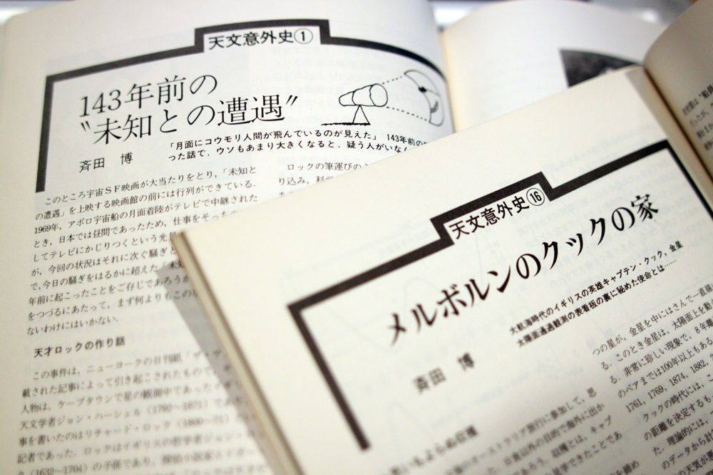斉田博さんは1978年に創刊された『星の手帖』創刊号から1982年の17号まで、途中Vol.11がお休みとなりましたが『星を近づけた人びと』の続編ともいえる「天文意外史」というタイトルで連載を執筆してくれました。のちに『宇宙の挑戦者』という単行本にまとめられました(加筆とともに掲載されなかったエピソードもついかされています)。 このシリーズを引き継ぐ形で、VOL.31から天文屋・石田五郎さんが「天文史」を担当しています。 |