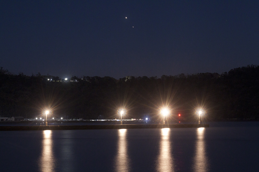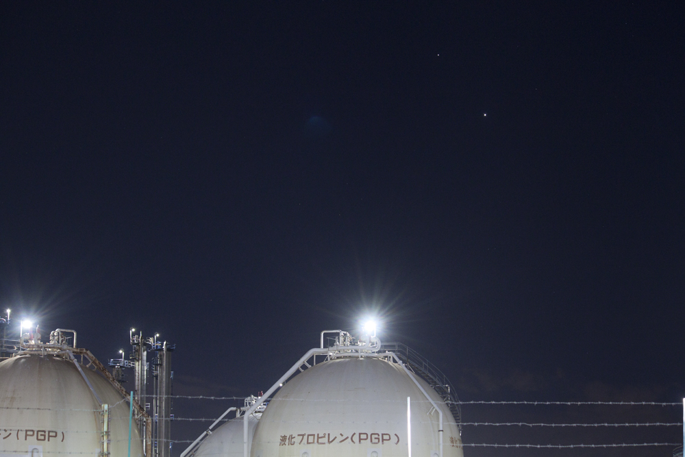 | 2020/12/06(17h28m)。 来月大接近する木星と土星。京葉工業地帯のガスタンクの上に並ぶ両者。こんなに環境の悪い空にもけなげにその姿を見せてくれていました。とはいってもかなり小さい… |