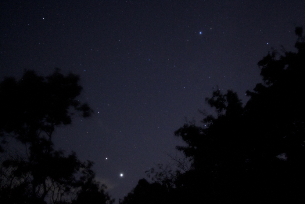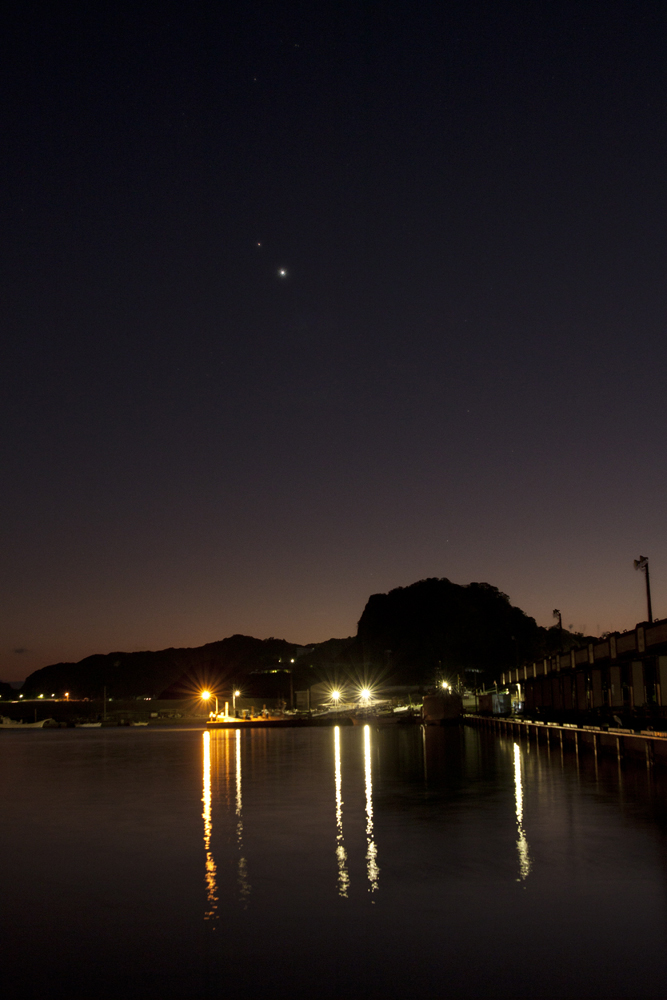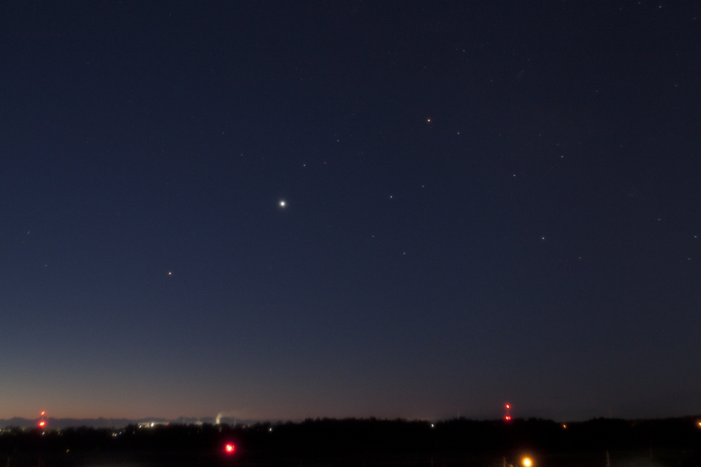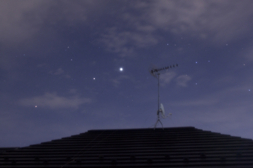 | 私が土星を初めて見たのは小学5年生の時。その時はまだ、どこに何座があって、どこに惑星が見えて… といった情報がないまま気ままに、誕生日にせがんで買ってもらった6センチの屈折望遠鏡を振り回していたときでした。 土星は地味な輝きのため、星座の中にいてもそれほど主張する物は感じられません(やっぱり望遠鏡で見たときが一番)が、私の場合、他の惑星との接近などのときだけ写真の対象になっている感があります。なので、ここに掲載する写真も、誰かとのランデブーばかりになっているような気がします。 |