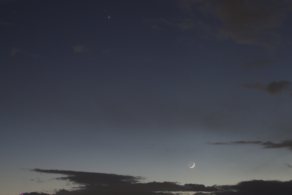 | 2020/12/16(17h18m)。 月齢1が地平線近く(撮影地では都心のビル群に手が届きそうな高さ)、まだ薄明に太陽光が影響していて市街地の邪魔は入っていない頃です。5日後の大接近にむかって、そろそろ月の直径分まで接近しているような感じです。 |