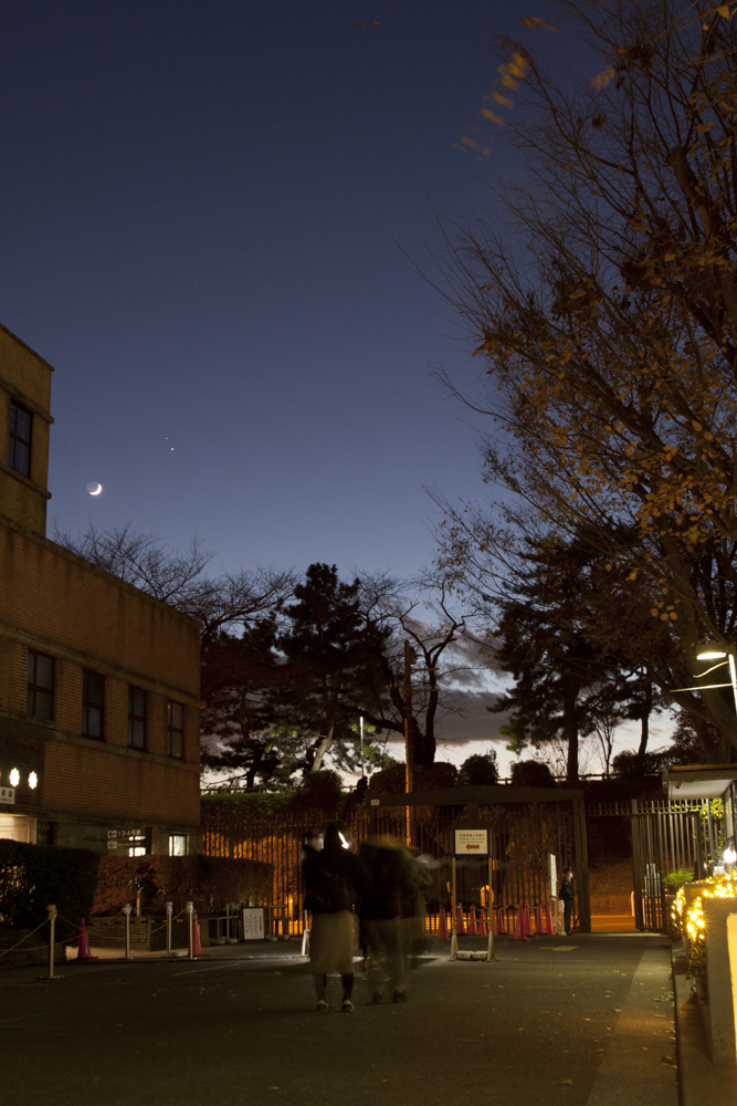 | 2020/12/17(17h10m)。 だんだん日没も冬至に向かって早まって来ているから、夕暮れもどんどん前倒しに… 帰宅時に校舎からでると日に日に夜に向かっているようです(じっさい真夜中近くまで居残ることアリ… それはそれでどうなのよって感じですが…)。普段は気にしていませんでしたが、同じようにスマホで撮影している人がいて、ちょっと嬉しく思いました。 |