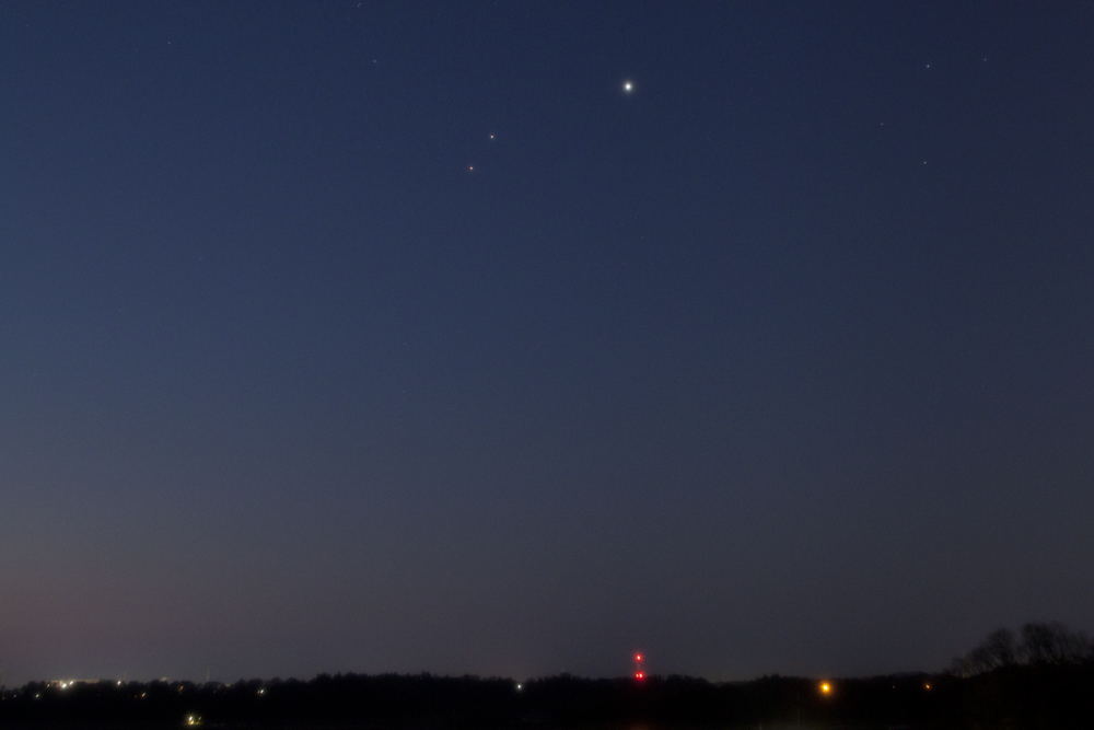 | 2020/04/03(04h33m)。 上の写真の約1ヶ月後、木星と土星は見比べないとわからないぐらいですが、今後地球に接近する火星は大胆にも順行(東へ東へ)していきました。 |