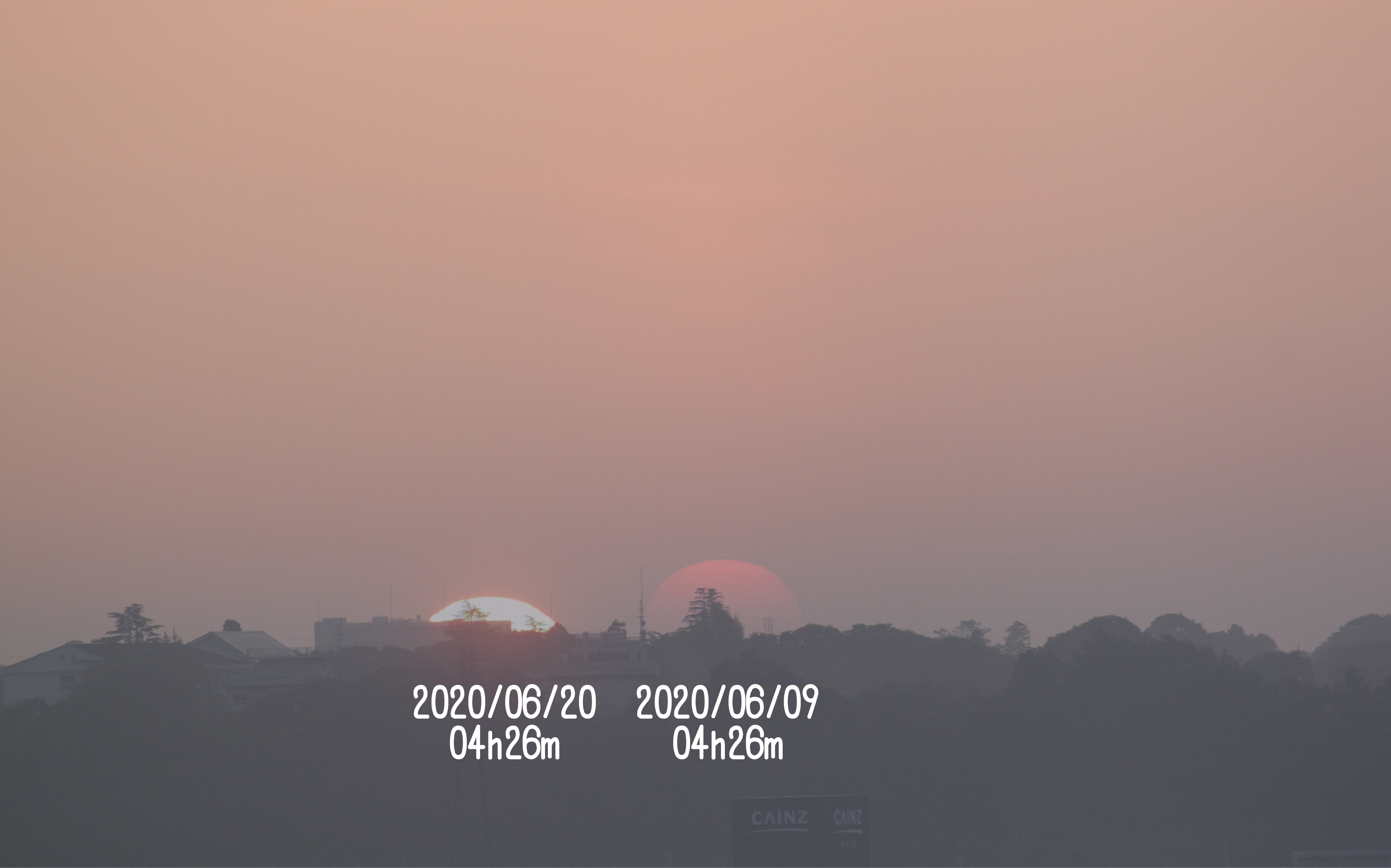 それにしても、ちゃんと方位とか測って、カメラレンズの焦点も計算に入れないと、こうなってしまう… 何もない風景を構図にするのは難しいです。仕切り直しと言う意味で、当時から始めた構図と合わせて新しい構図でまた1年続けてみます。たかだか24枚シャッターを押すだけですから(?) |