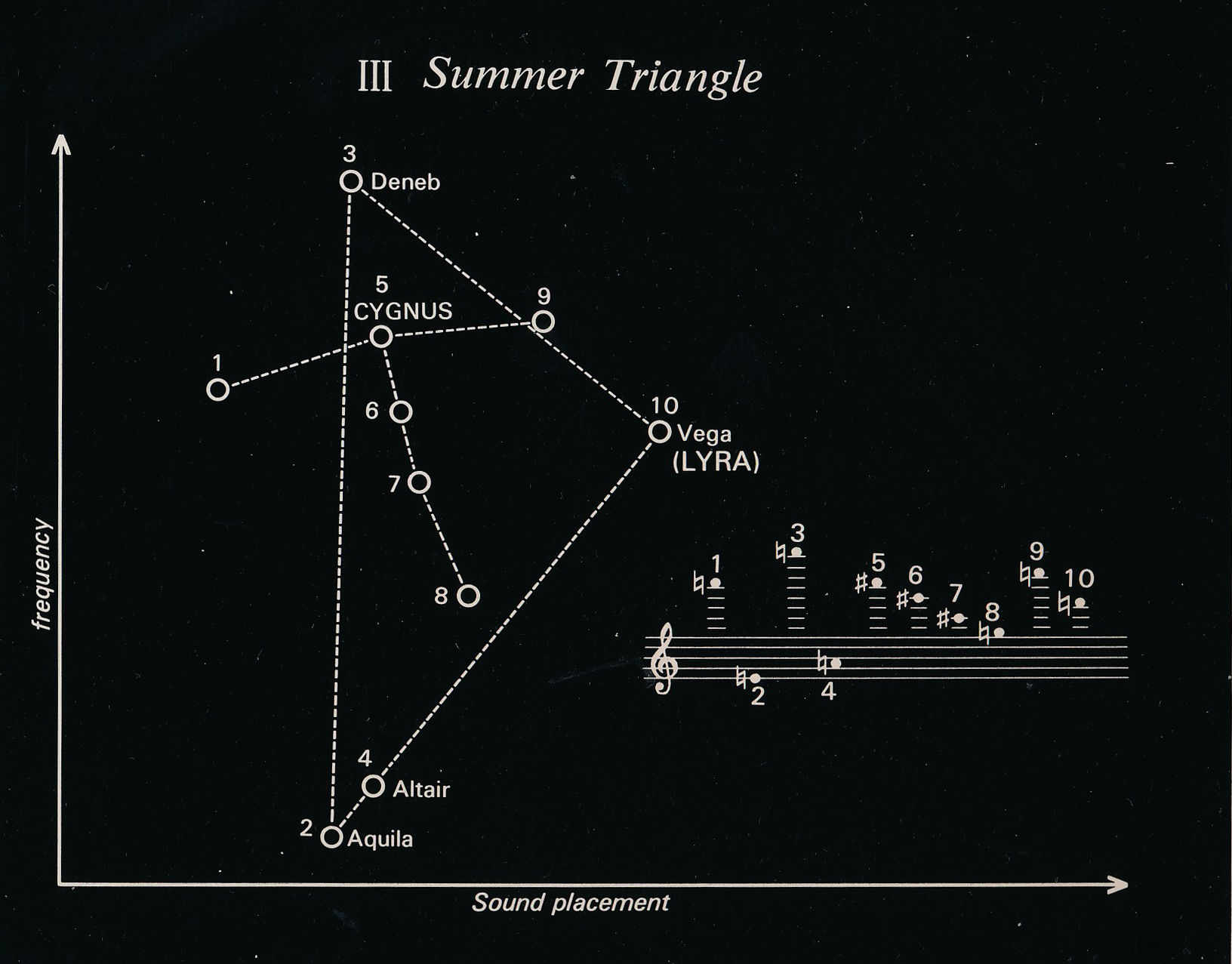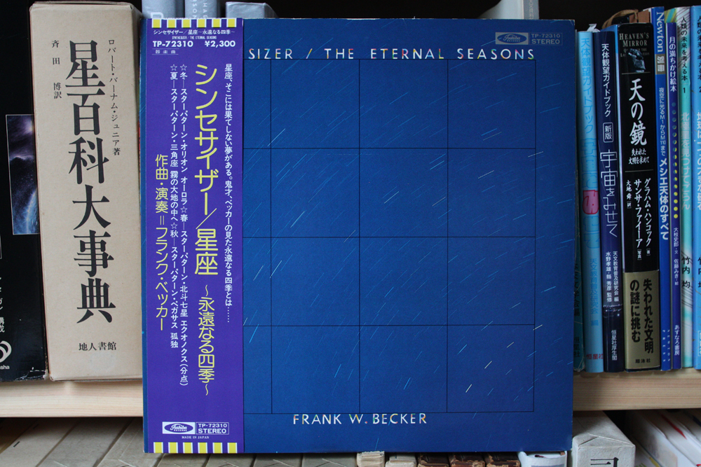 | 小学生の頃、従兄弟の家に遊びにいくと、必ずレコードを聴かせてくれました。その中で見つけた一枚が「星座」という名のアルバム。原題には「星座」という言葉は使われていませんが、このタイトルはヴィヴァルディを連想させます。そう思って調べてみたら、このアルバムとは別にベッカーはヴィヴァルディの『四季』も新星サイザー化していました。それに合わせて日本のレコード会社の担当が『星座』という名前をつけたのではないかなぁ、と思います。また、曲名も、その曲の素材となった音型も星座、もしくは星の並びから創作されているようだし… 裏ジャケットには曲の副題となっている星座、もしくは星の並びを表す星図が掲載されていて、それぞれの星々を楽譜にプロットさせてメロディを充てていました。 その頃のシンセイサイザーの流行りと言えば、冨田勲の作品群で『惑星』『宇宙幻想』は天文ファンには一番の人気作でした。 この『星座』は、冨田勲のシンセと比べると、音色が一色で、しかも雰囲気は良いとしても音楽を楽しむという点では個人的には消化不良気味でした。ただ、天球に貼付いた星の位置を楽譜に当てはめて音型にする、という試みは、たとえばジョン・ケージの『南天のエチュード』に先例があるので、天球の音楽を探し求めている私には、昔の記憶を頼りに、アーティストとか、ジャケットがどんなだったかを思い出しながらレコードを改めて探し求め(音源は従兄弟が所有していて、「どっかに行っちゃったよ〜」と行方不明になってしまったため…)ようやくヤフオクで見つけることができました。 30年ぶりぐらいに聴いたレコードでしたが、やっぱり消化不良は変わらず(笑)。そして、ヴィヴァルディの『四季』を演奏しているレコードも発見しました。ヴィヴァルディの『四季』のシンセサイザー版と言えば、冨田勲よりも早く『惑星』をシンセイサイザー化したパトリック・グリースンのレコードがありますが、それよりも早く取り上げていたことになります。また、フランクのレコードには、シンセサイザーのみの演奏ではなく、日本人ヴァイオリニスト辰巳明子が参加しています。 |