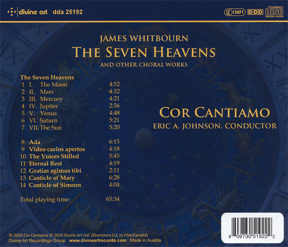 英国のジェームズ・ウェットボーン(1963 - )が作曲した「7つの天国」と題された組曲で、望遠鏡が発見される以前の、まだ太陽中心説だった頃の7つの天球をテーマにしています。曲順はカレンダー通り(笑)。曲の雰囲気は、おそらく誰もが比較するであろうホルストの組曲を意識しているようで、そこから抜け出すのは難しいのかもしれません(作曲家も聴き手も)。ただし、その書法はユニークで、メインは合唱で、伴奏楽器が器楽ソロというもの(ヴァイオリン、チェロ、フルート、クラリネット、ファゴット、フレンチホルン、ピアノ)。私が最初に「どんなかなぁ?」とチョイスしたのは金星で、これはえも言われぬぐらいの、ホルストのそれを凌駕しているのではないかと思えるほどの、ギリシア神話のヴィーナス(アフロディテ)を描いた画家たちのイメージが浮かんでくるようです。私にとっては夕暮れの宵の明星か、東雲の明けの明星を眺めているときの心境。アルバムジャケットも、想像をかき立ててくれる獣帯をあしらったもの。 |