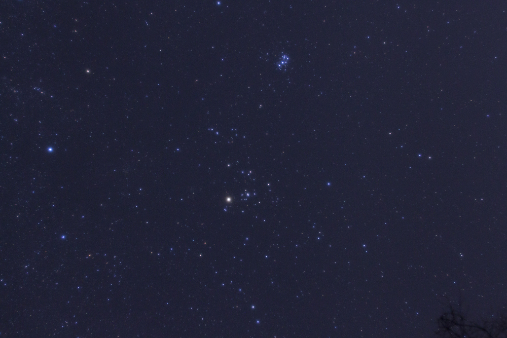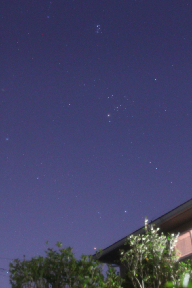 狩人オリオンと戦うように後ずさりしながら東の空から昇ってくるおうし座。実は、オリオンと牡牛は親子の関係でもあるため、実際には戦っているのではありません。オリオンの狙いは、牡牛の肩先に隠れているプレアデスの7人姉妹。 |