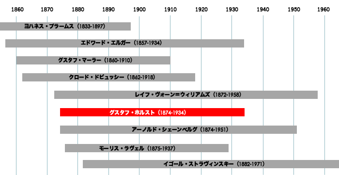 大管弦楽のための組曲「惑星」を作曲した英国の作曲家グスタフ・ホルスト(1874-1934)の、生誕年から亡くなるまでの間に起こった天文史(現象)と音楽史を合わせてみました。 “天体の運行を大きなハーモニーと考えて作曲した” |