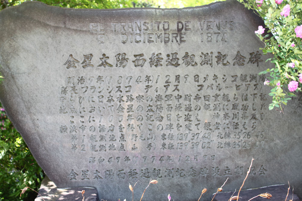 | *エドモンド・ハレー(1656-1742)が「地球-太陽間の正確な距離の測定方法」として提唱し、初めて巡ってきた珍現象です。これは金星の日面経過を観測することで、地球-太陽間(1天文単位)を正確に求めることができる、というものでした。世界中の先進国が国家の威信をかけて競って世界中に観測隊を組織するほど大規模で、全世界的な観測体制が敷かれたことは、天文学史上かつてありませんでした。特に1874年は日本での条件が良かったために、フランス、アメリカ、メキシコ、の3ケ国が 長崎(仏・米)、神戸(仏)、横浜(メ) に観測隊を組織し、各地に観測碑が建てられました。 この金星の日面経過には周期があり、1874年と1882年と対に起こったあと、次回となった私たちの時代の2004年と8年後の2012年に起きているのは、記憶に新しいところですね。私も含め多くの方々がマスメディアを通じてでも、この現象を目撃することになりました。 |